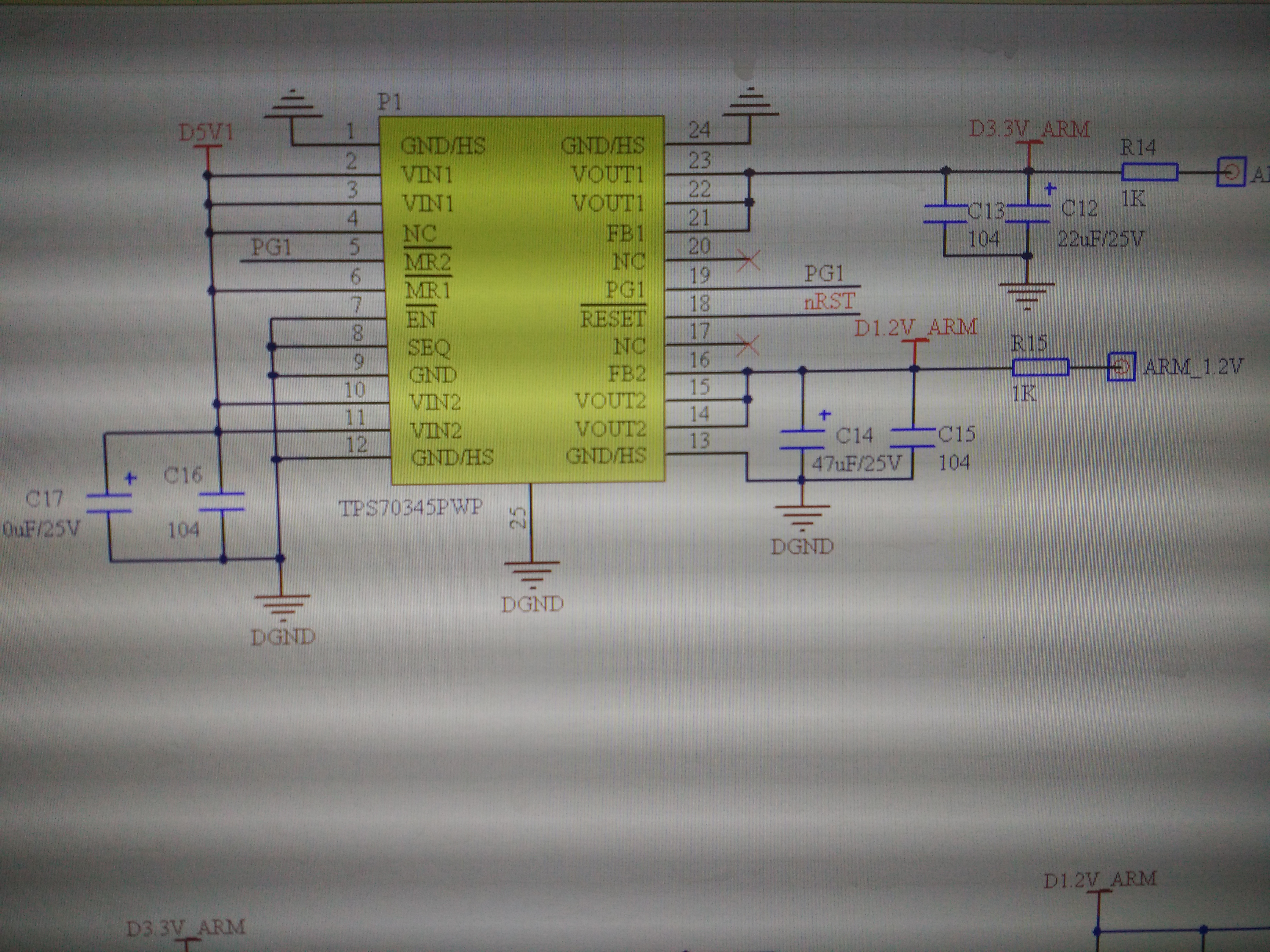 采用TPS70345为ARM LM3S9B92芯片供电,电路原理图如下图所示,为什么测1.2V的输出电压值为接近1.3V,请教一下是什么原因?谢谢
