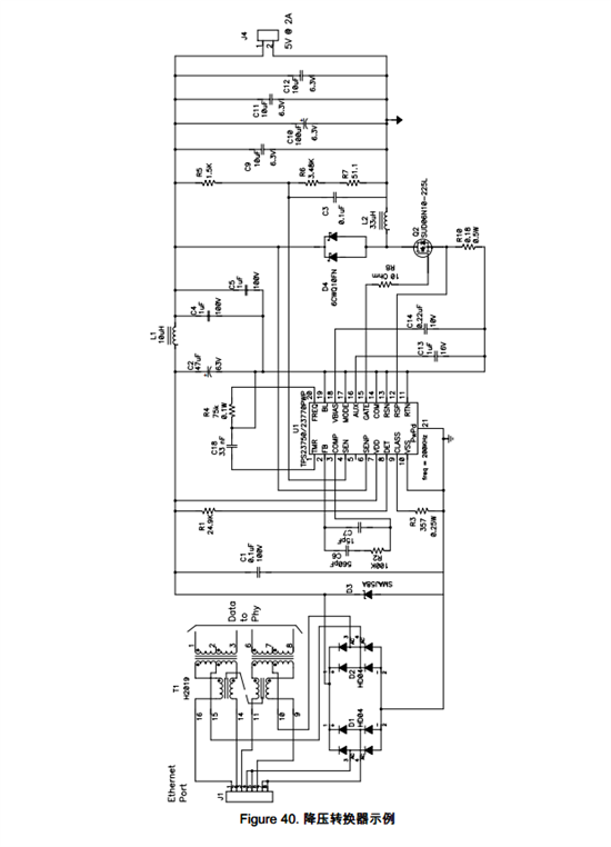 按照数据手册的降压转换器实例,电路不会输出5伏,POE的输入电压一直从0伏跳动到50伏