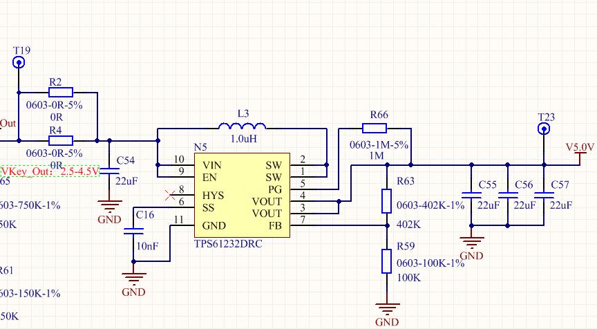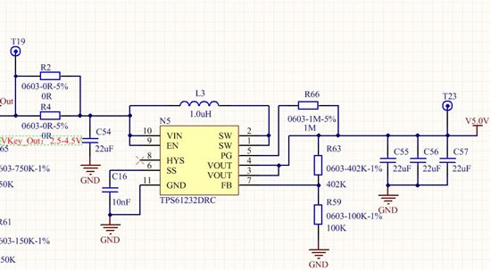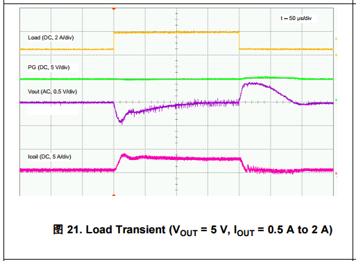 情形1、采用电感器LQH44PN1R0MP0,当输出负载电流变化时,输出5V最低跌落到2.6V左右,导致电路中的某些功能不正常工作。