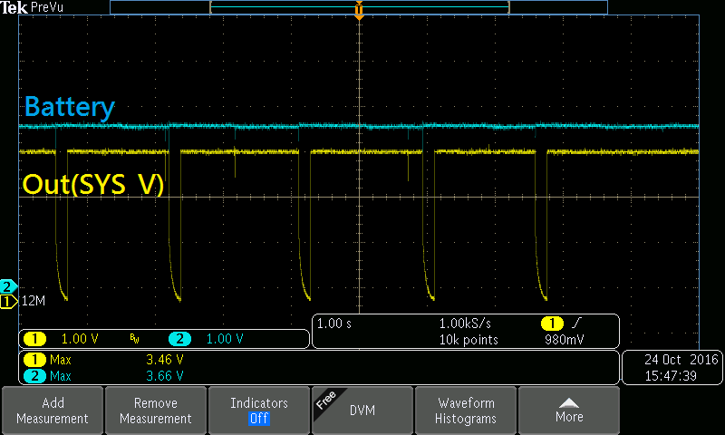 我用电源供应器模拟电池电压3.5V在VABTT_V, 而当我做系统抽载(约200mA)时会出现电压Drop现象如图