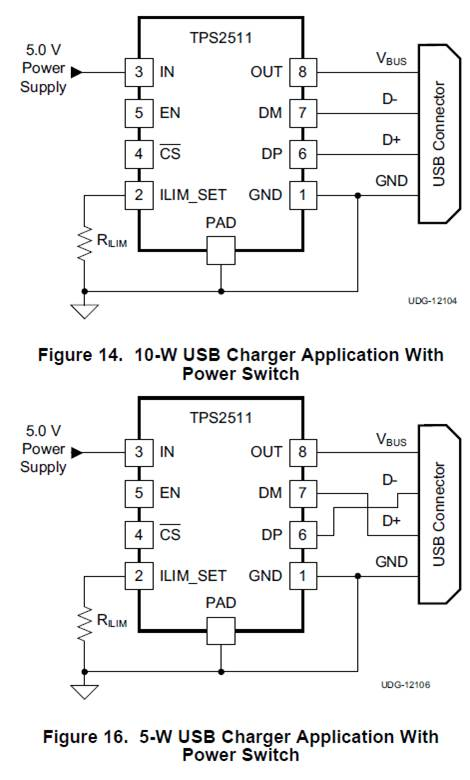 • D+/D-反接,是通知后级的苹果设备只拉最大1A的电流;而设置芯片的current limit,表示TPS2511最大电流能力是1A, 如果后接的负载电流能力超过1A(比如iPad),TPS2511仍然输出1A,但输入电压会掉落到较低电平(等于后级设备的VIN 电压动态管理点,达到该点后,设备会将降低充电电流)。