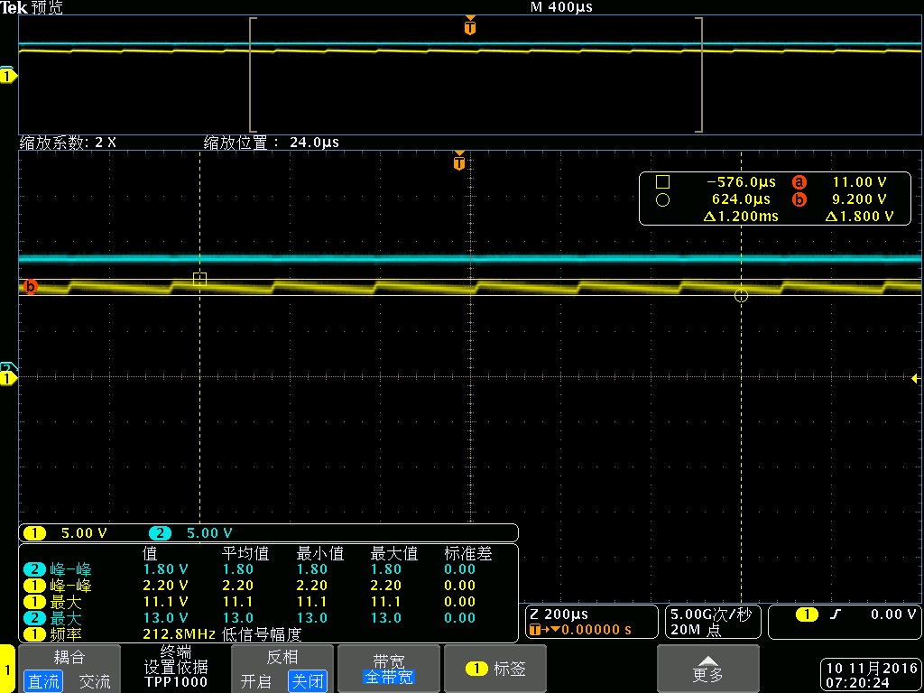输入12V,输入经测量比较稳定;输出不稳定,呈锯齿状,最高11.6V,最低9V,周期约210us,输入和输出均放置1个10uF的电容