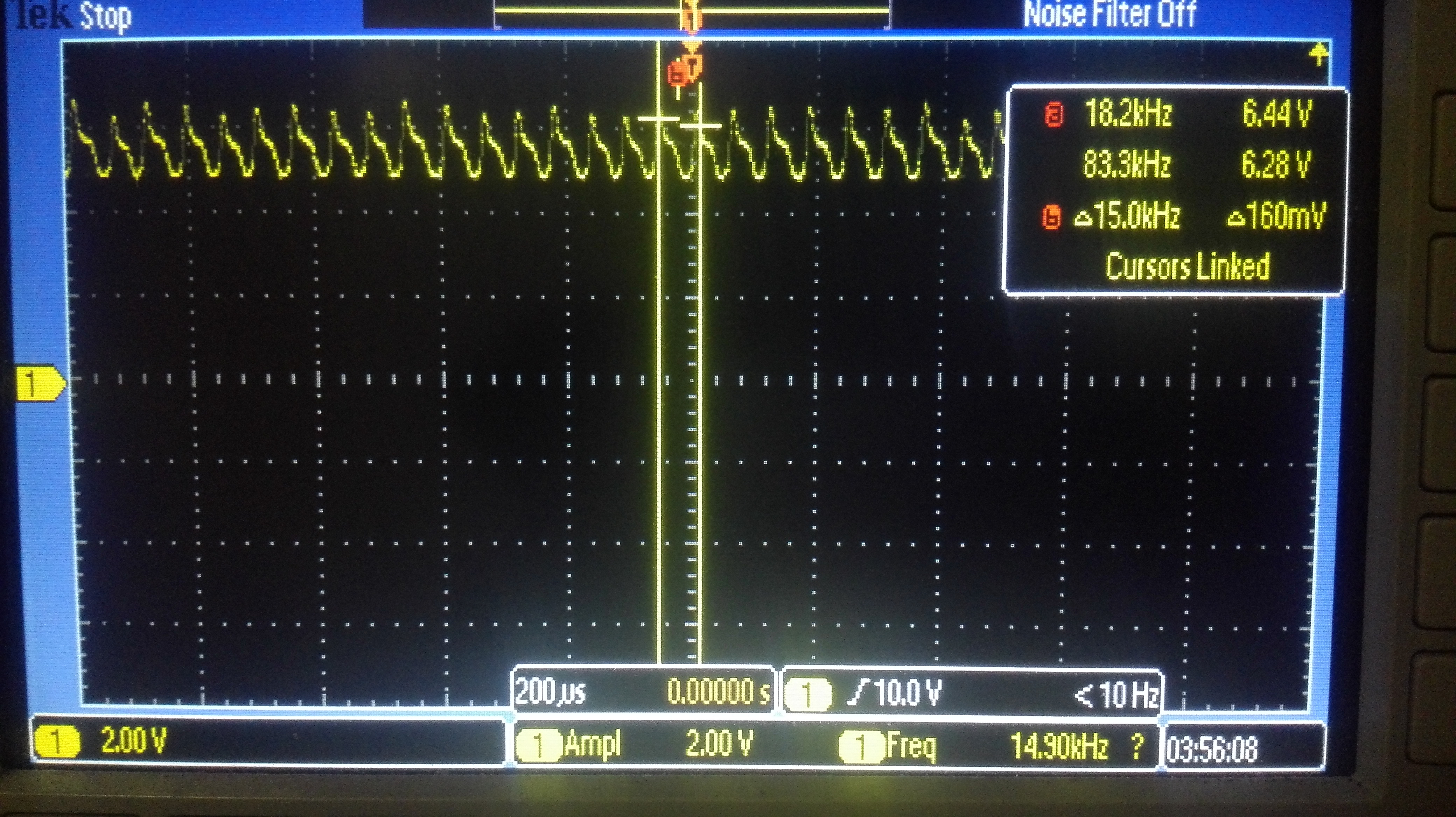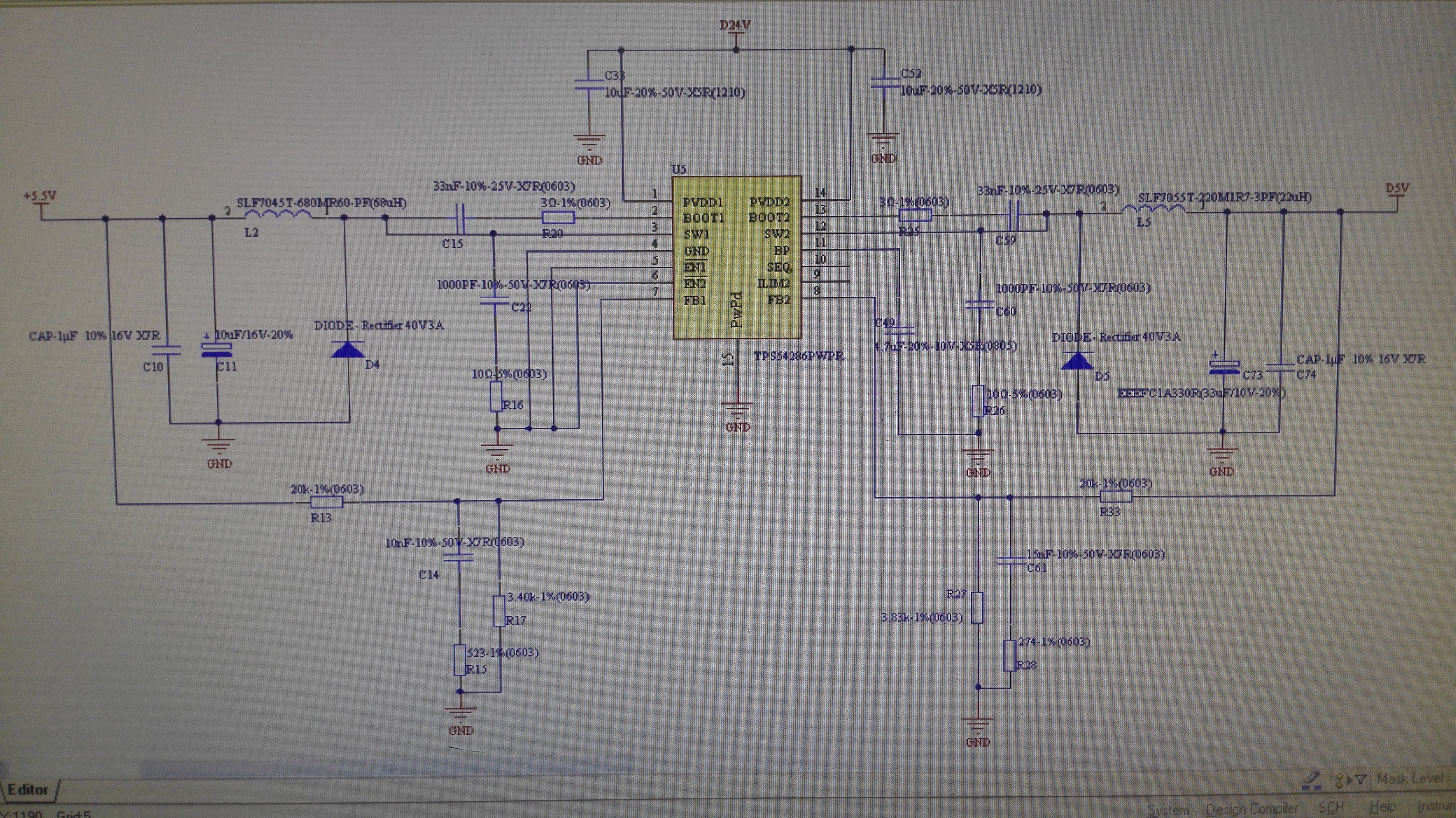 使用TPS54286这款双路DC-DC转换器,实现24V输入,5V和5.5V输出,上电后电路能工作,但仔细听能听见有噪音,但也不是明显的啸叫声,再用示波器查看输出,发现5.5V输出电平上叠加了个幅值为2V、频率为15kHz左右的干扰信号,由于此电压供给后面LDO再到模拟电路,明显严重干扰后级模拟信号波形;5V也有类似情况,但幅值小,另外后面再通过一级DCDC,然后供给数字电路,基本上影响不大。相关电路图、PCB布局图、5.5V波形图见下,请各位大神不吝赐教,谢谢!