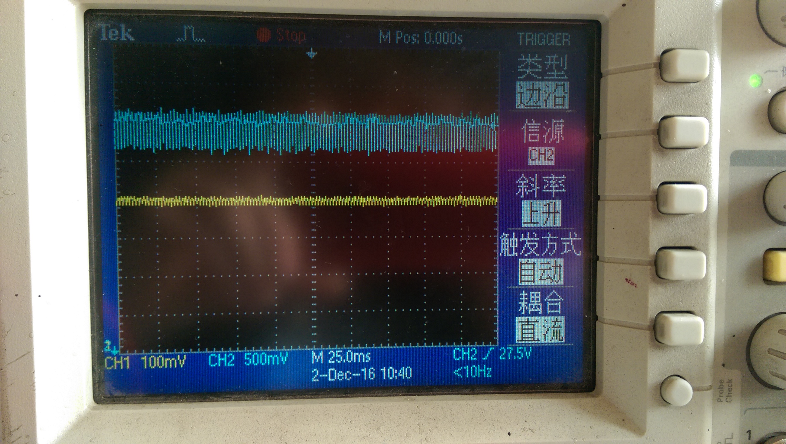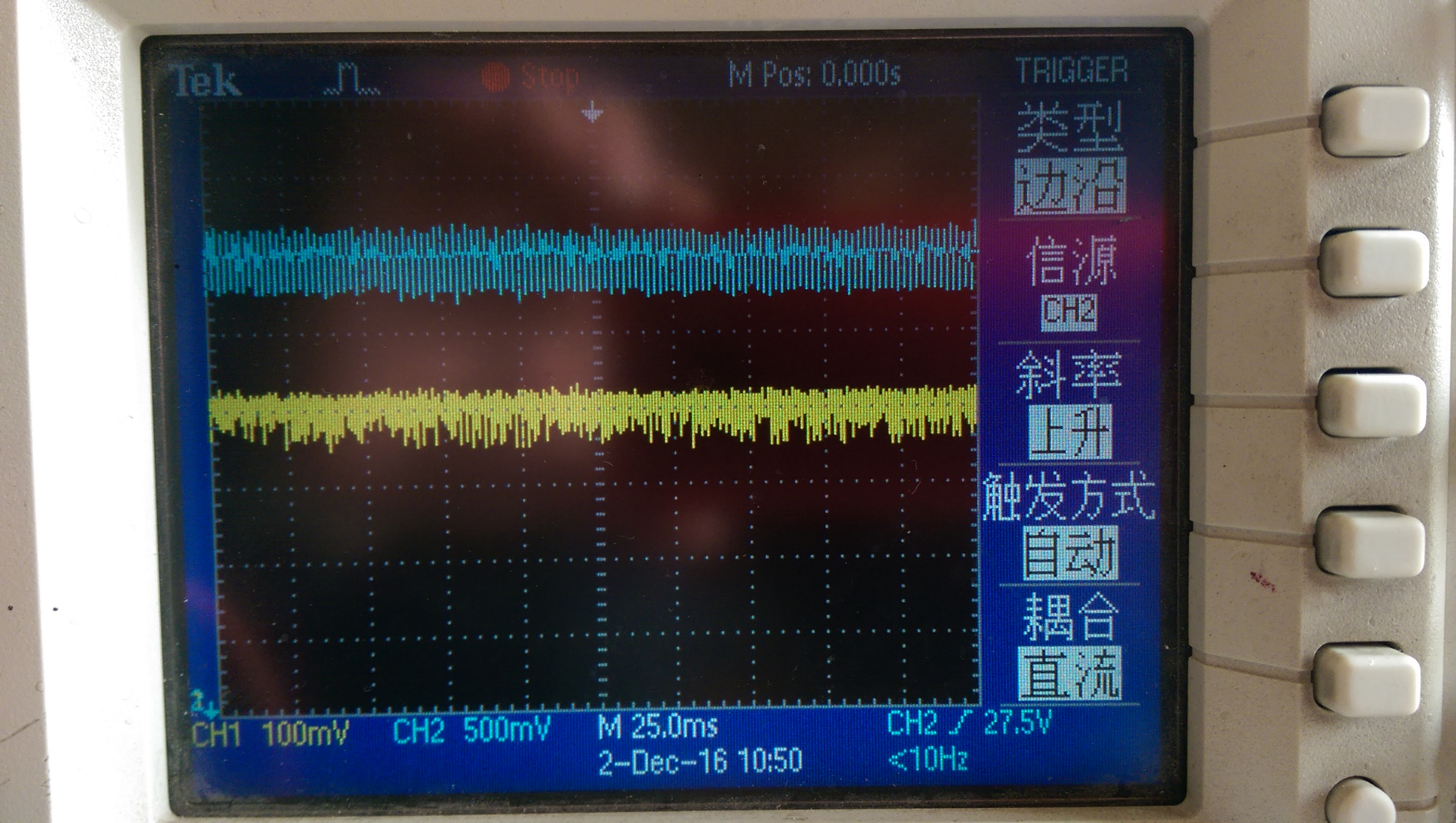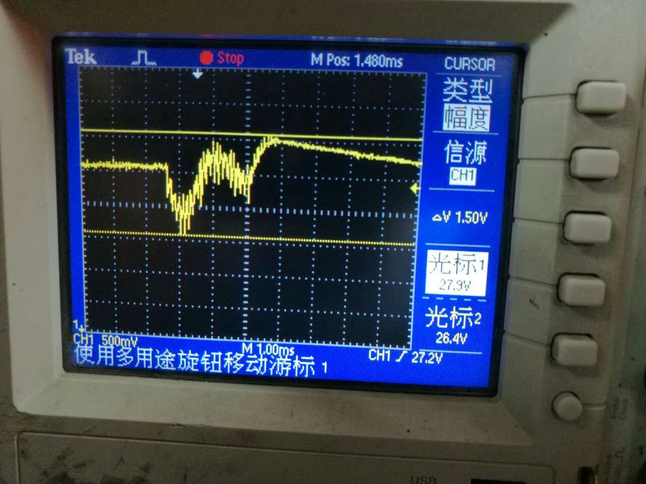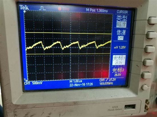 负载约27V,600mA,当负载以15KHZ的开关频率工作时候,会有[-0.5V , 0.2V]的电源抖动