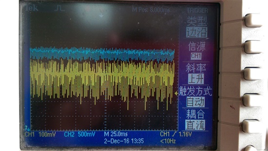 3、接喷头(负载,工作频率1KHZ),时间为25mS/Div,测得的波形DA输入(进芯片FB)还好【-20mV,20mV】,输出有抖动,大概【-350mV,150mV】
