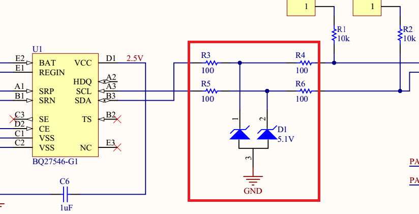 BQ27546芯片可采用I2C接口与上位机通信,请问在开发板BQ274546EVM的I2C接口电路部分,这两个稳压二极管是起到什么作用,与之相接的两个电阻又有什么作用?在设计时,能否把这两个稳压二极管去掉,直接在SCL和SDA线上上拉10k电阻到VCC?