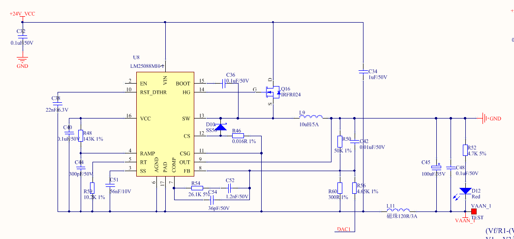 我使用LM25088芯片做一个-7V到-15V输出的电路,请问做负电压这种应该怎么计算,我计算的方法是(V1+Vo-1.205)/R124+(Vo-1.205)/R118=1.205/R128,目前我的R124取值2.2K,R118取值18.7K,R128取值1K,V1输出0V时,Vo只有-3点几V,理论值应该为-15V才对,请教大神计算方法是否有误?