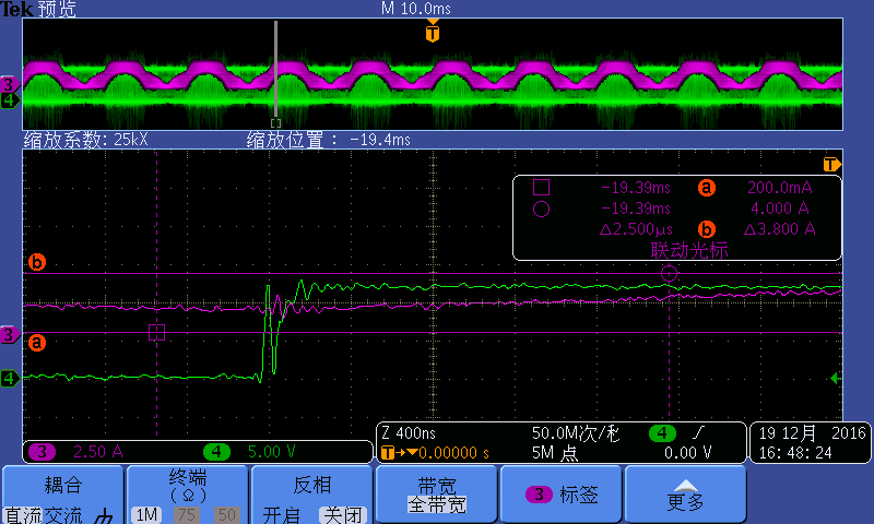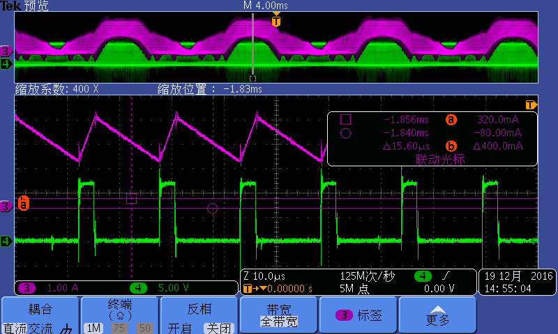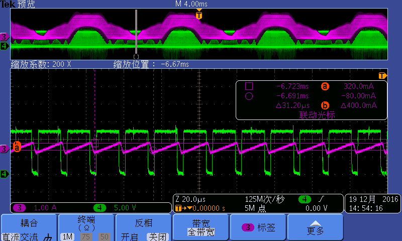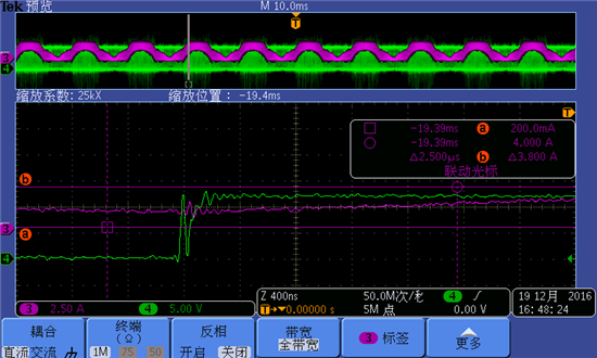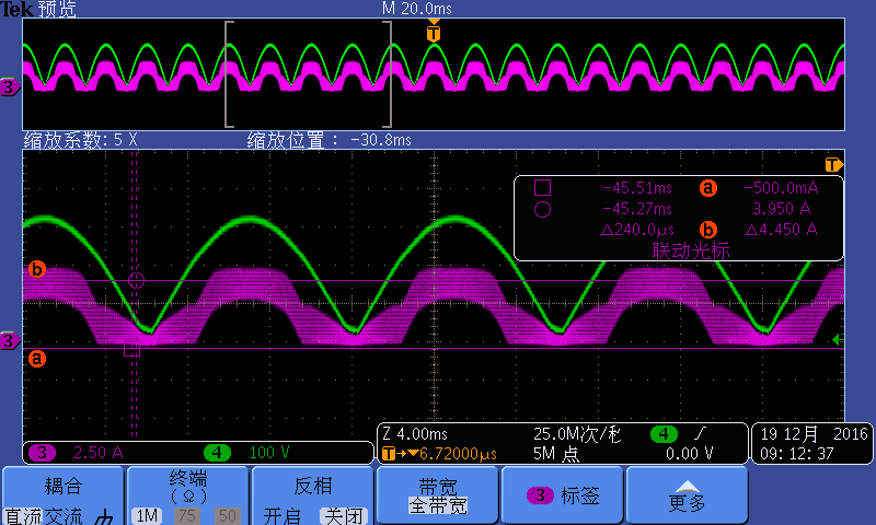 pfc模块前,整流桥后的电压波形。以及pfc采样电阻前端的波形。