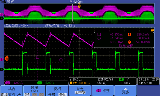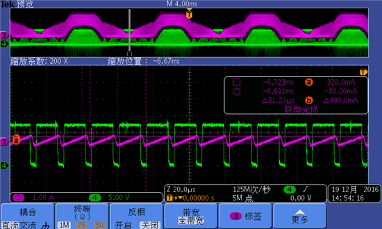 这是PFC开关管,当开关管占空比比较大的时候,栅极初级没有明显的震荡现象。测试点:pfc开关管栅极。