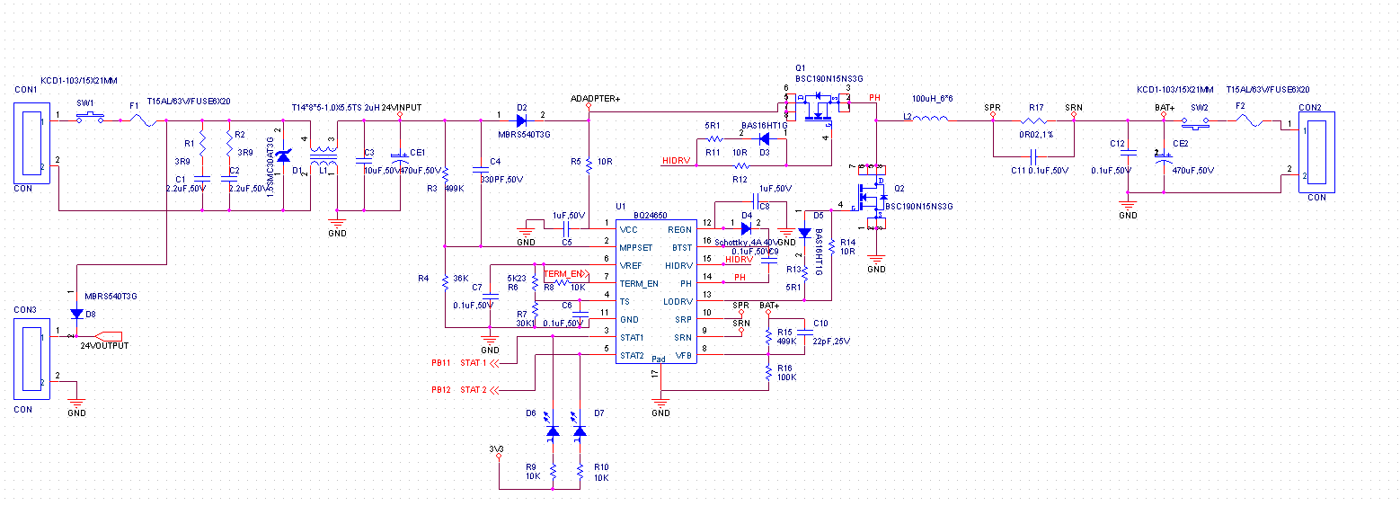 目前使用BQ24650的充电管理芯片,外围参数完全按照datasheet中设置。用来给铅酸电池充电,没用使用太阳能,MPPSET直接用两个电阻分压,TS已经并联10K电阻。目前各管脚电压如下,VCC=24V,MPPSET=1.6V,TS=2V,VREF=3.3V,TREM_EN=2.8V,REGN=6V.上管有驱动,但是驱动不是方波,很乱频率也不对,下管基本没驱动,带电池没有电流出来,有输出电压,约12.5V。输入用DC电源输入24V,输出外接铅酸电池(12V,20Ah),充电电流设置2A(20mohm),两MOS都使用的是BSC190N15NS3G。已经试过很多方法,请各位帮忙看看。谢谢!