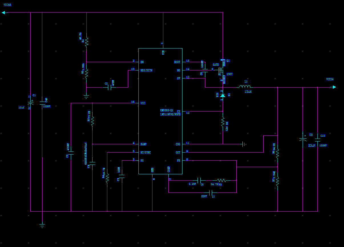 用LM5088做了一个48V转24V/5A电源,参数都是参考官方提供数据,输出电压一直在4.4V,测量SS脚与FB脚电压,均没有达到1.205V,大概两百多毫伏,去掉SS脚电容后,SS脚与FB脚的电压达到1.06V左右,输出电压为22V。一直怀疑是SS脚处的电容值选的有问题,或者是环路补偿选型有问题,请问有能帮上忙的吗