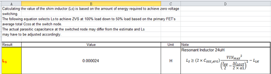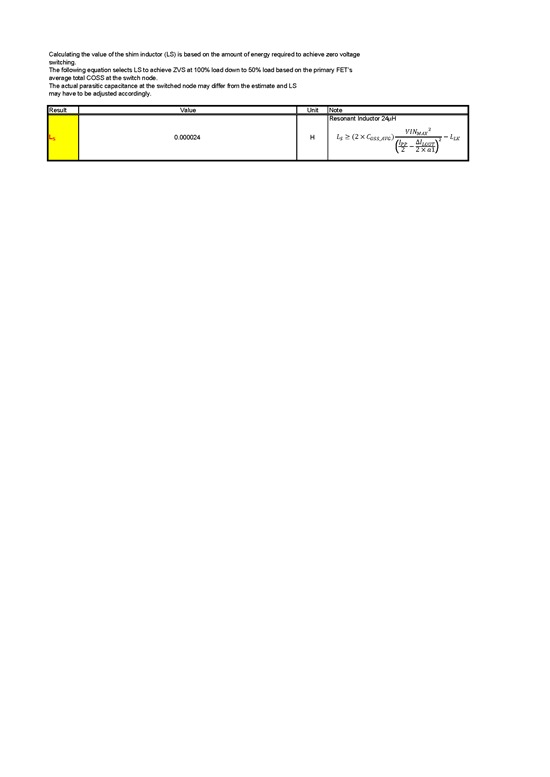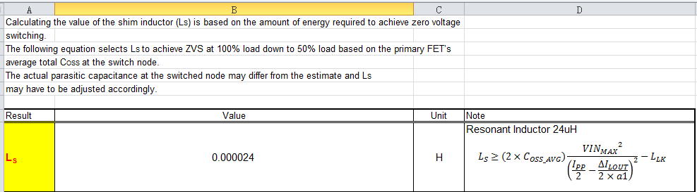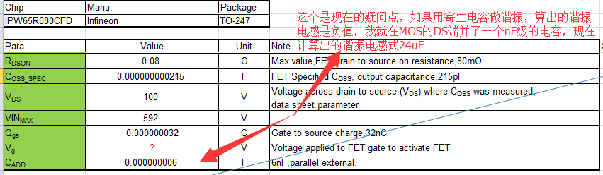 发现按照手册中的公式计算谐振电感时,是负值,综合考虑了计算公式,最后在MOS的DS端并了nF级电容,计算出的谐振电感量是24uF(变压器原边漏磁暂定2uH)