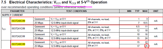 在ISO7240手册中,当VCC1=VCC2=5V时,ICC2要求最大25mA: