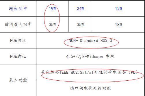 该POE供电器的描述比较奇怪,19W应该是IEEE802.3at标准下的Class 4,但根据标准其峰值功率为35W,并没有满足IEEE的标准的28.05W。并且其下面的表格里面的描述也不一致。有可能是非标准的POE;如果有检测,功率分类,供电等环节的POE为标准的POE。建议购买后实际测量并判断。