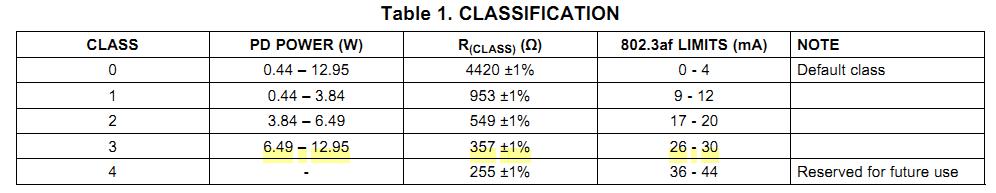 CLASS PD POWER (W) R(CLASS) (W) 802.3af LIMITS (mA) NOTE