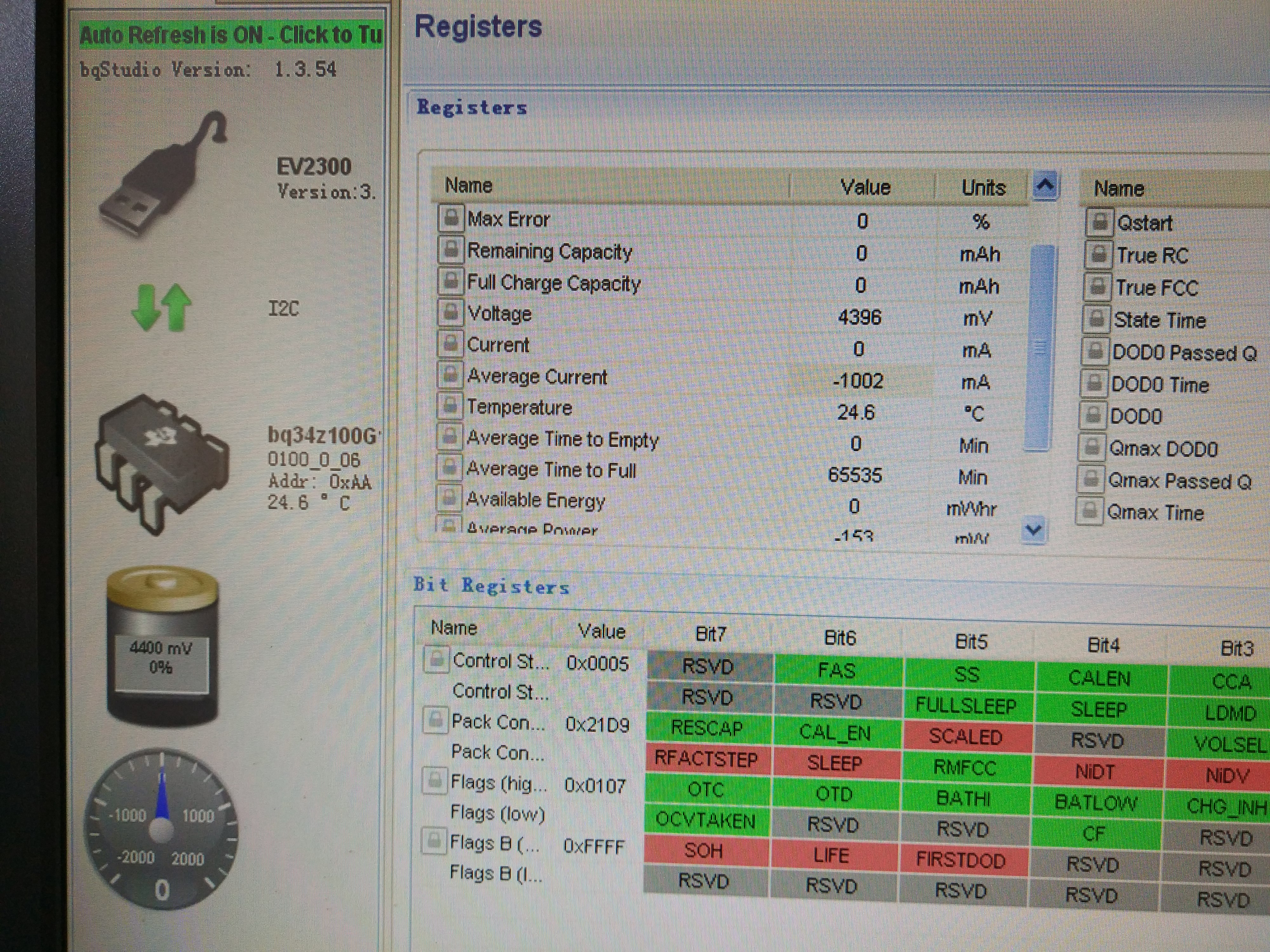 bq34z100evm板外接电池和负载,测得average current是对的,但是current为0,按照器件bq34z100g1文档这两个参数描述几乎一致,均为每秒更新,为何一个没有数值?请指教