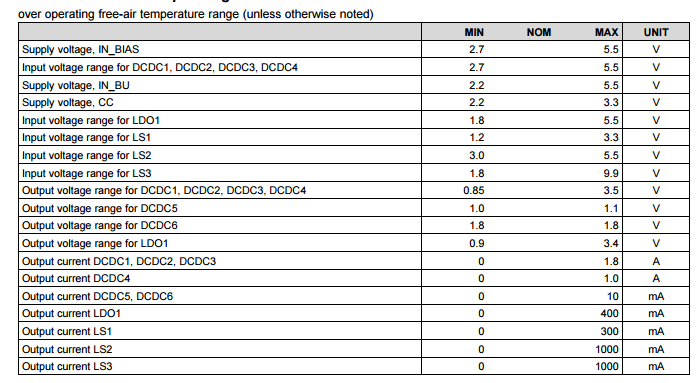 见TPS65218datasheet 各路输入范围输出范围以及负载范围: