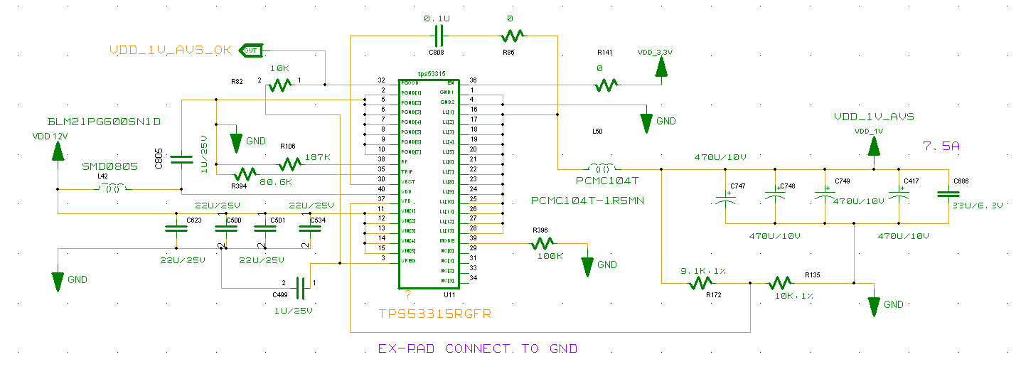 我按照TPS53315数据手册推荐的图33做了电路,该电路能正常输出1.1V电压。但用手使劲按在该芯片上,电路会瞬时掉电,输出变为0。这是为什么?是手接触了那个引脚引起的?做了200张板子,都有这个问题。手不去接触芯片,电路工作正常。电路图如下: