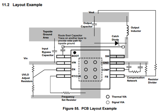 2.输入回路太大了,加上陶瓷后,必须确保陶瓷和VIN pin, 二极管GND,这个回路足够小(限制的layout这个环路很大很大很大。)