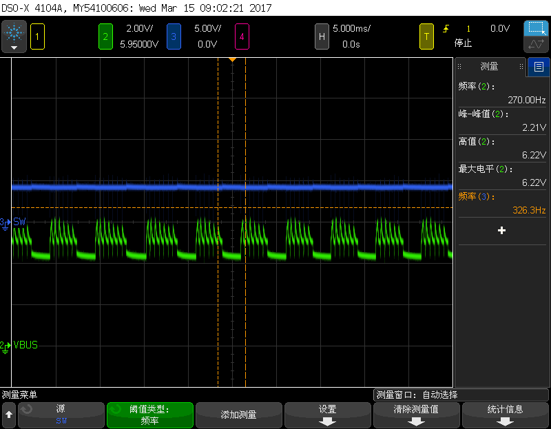 现象:此时测试充电IC输入电容的上电压有振荡(如附件),sw脚的占空比几乎为100%,且有电流进入电池中,大约70多毫安左右;如果把电池调到4v以下,充电IC输入端电压不再振荡;把DPM值设置为4.6v后,电池电压为4.25v时,输入电压也没有振荡。