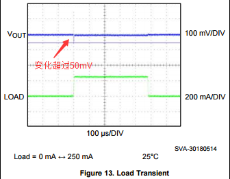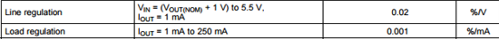 负载调整率是指LDO负载变化对于输入电压的影响,以上述芯片例子中输出负载从1mA瞬态变化到250mA, 输出电压的变化是0.001%/mV(每一mA负载电流的变化带来0.001%的输出电压变化, 那么250mA所有引起的变化时0.25%.