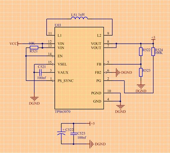 1,建议你先用webench软件进行器件参数的选择 http://www.ti.com.cn/product/cn/tps63070(Webench在该页面的右下角)。因为从原理图中你没有输入电容,也没有输出电容的具体取值。