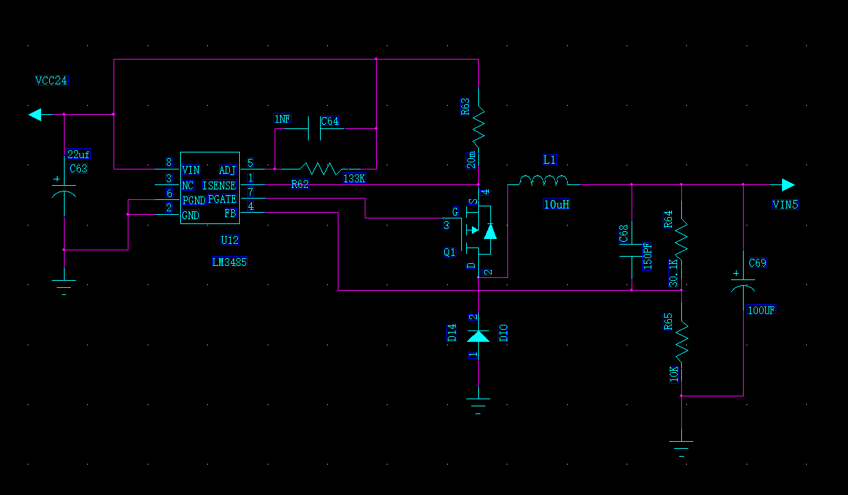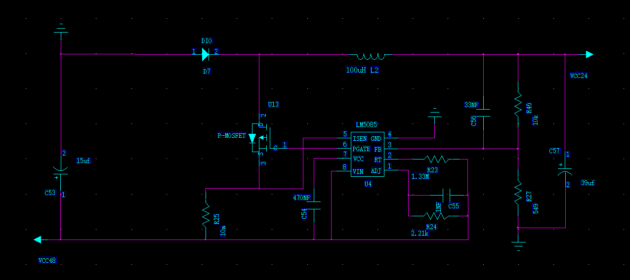 现有电压48V,需要用到24V和5V电压,搭了两个BUCK电路。一个用的LM5085芯片,将48V转成24V;另一个用的LM3485芯片,将24V转成5V。两个电路单独工作都没什么问题,但是两个电路连接起来后,出现24V的输出处只有17V左右,5V输出处正常,请问有人遇到过此类问题吗?有什么解决办法呢?