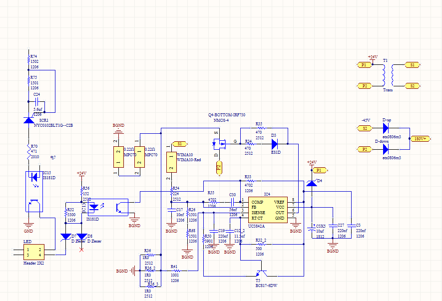 功能:通过及变压器实现输出电压的放大、频率的增加,通过UC3842实现电流对电压的反馈控制