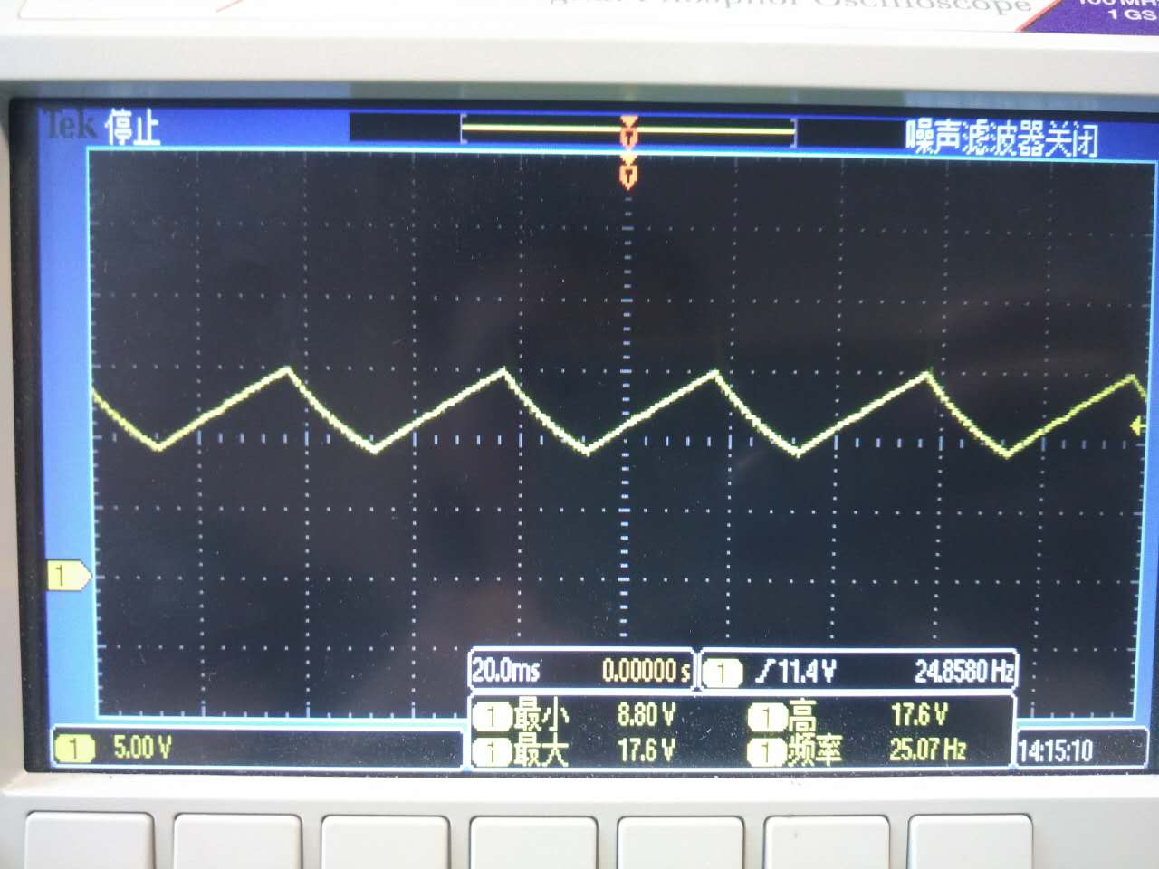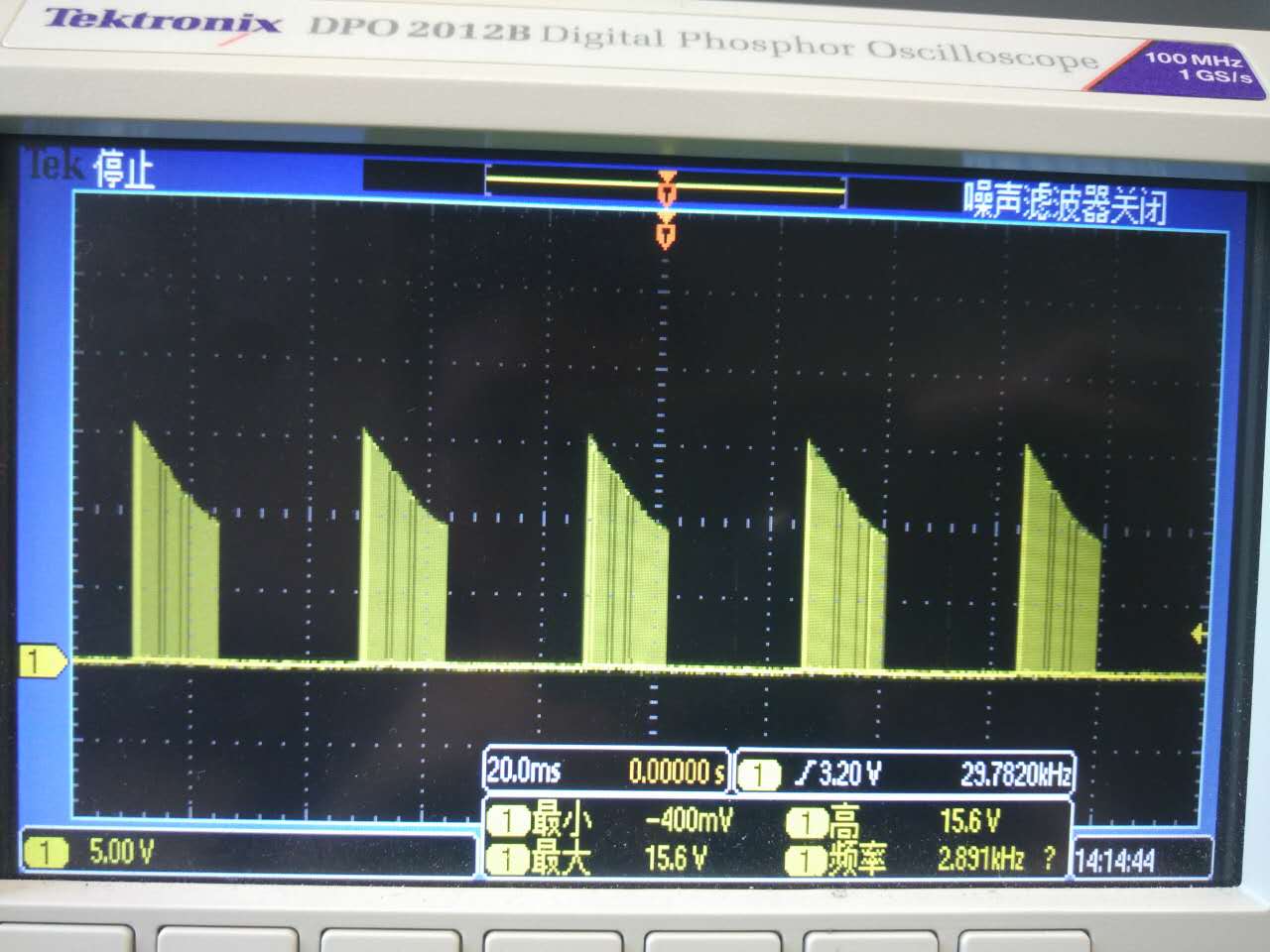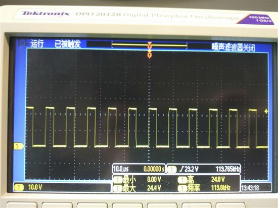 ②只有T1变压器没接上时,UC3842 VOUT信号见下图:最高是24V的矩形波。