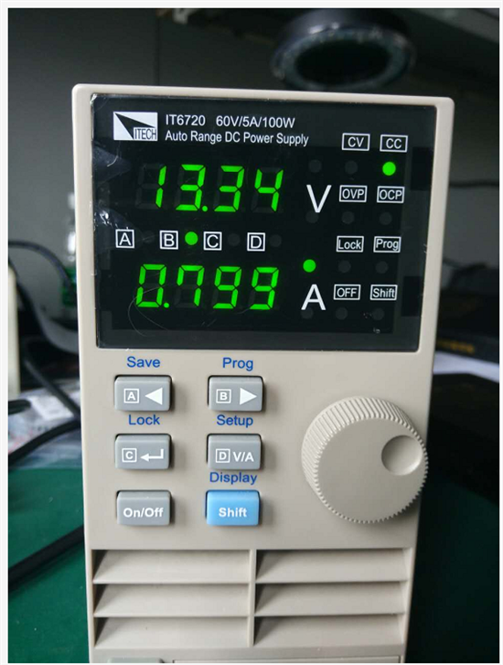 ①输入电压:恒定24V(由直流稳压电源提供,最大电流限制为800mA,默认CV模式)
