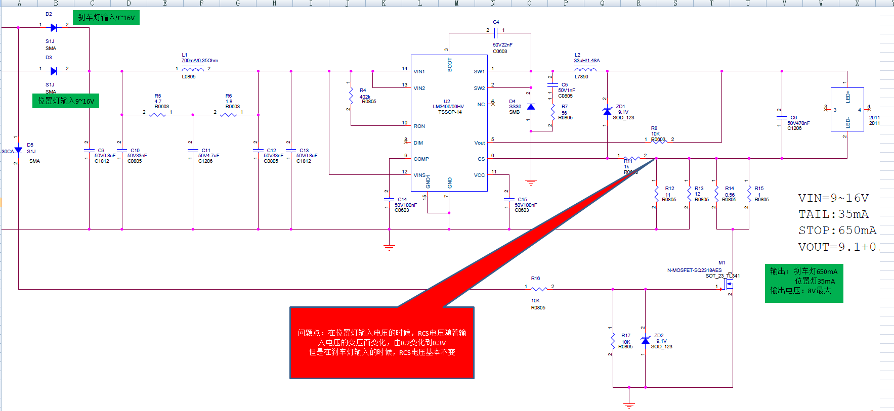 这个电路因为有2种电流输出,35mA,和650mA,我是改变CS脚电阻来实现,