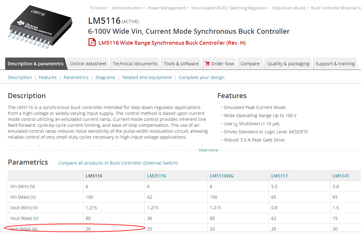 LM5116的参数介绍里写Iout可以达到20A,但是datasheet里面又只有Peak LO Sink Current 3.5A