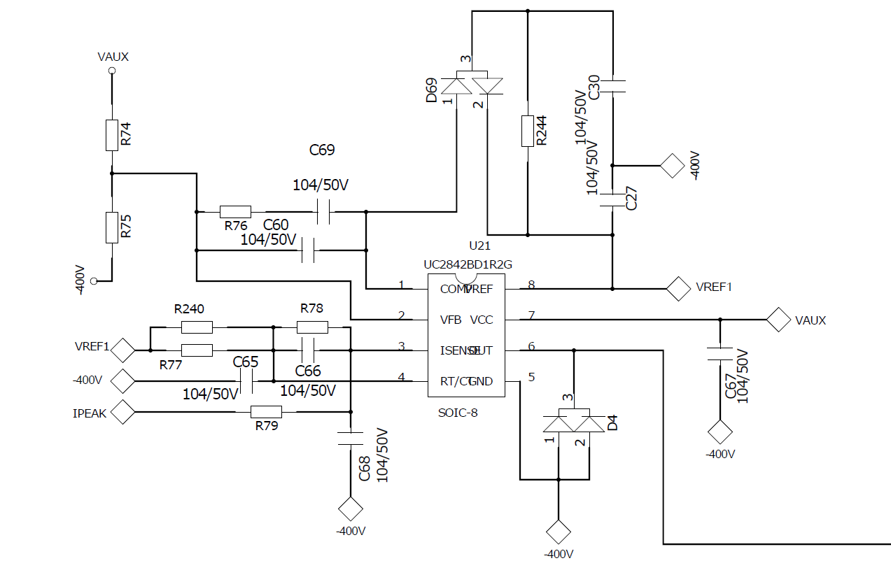 请教一下:该电路中,电路中的RT、CT是哪个电阻电容,稳压管D69的旁路电阻电容是什么作用,还有5脚为什么不是接地,而是接-400V,7脚通过电容接-400V的作用是啥,IPEAK的作用是什么,比较困惑,求大神解答,谢谢