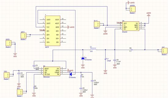 在校大一的学生,我这里vin用的是30V的电压,fz v+1那里是辅助电源用的是5V,因为实验室只有一个稳压源,所以我把ADC那路也接到了辅助电源上去,EN也接过去了,测量的时候输出的电压比较小是-0.22v,我阅读了一些关于tps54340的帖子,可以在vfb那里通过插入电阻来控制vout。但为什么是负电啊?我是否应该在vfb那里装上电阻?还有那个lm339,输出高电平什么意思?我测量ina282那里的输出电压也是负电正好是-5v,接的地是gnd
