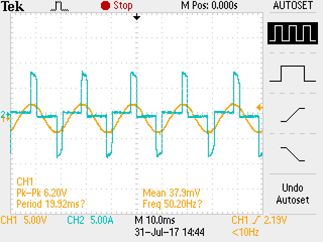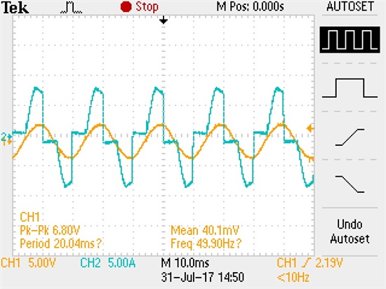 如下图所示,黄色为AC24V输入电压,蓝色是电流(使用电流探头测得)