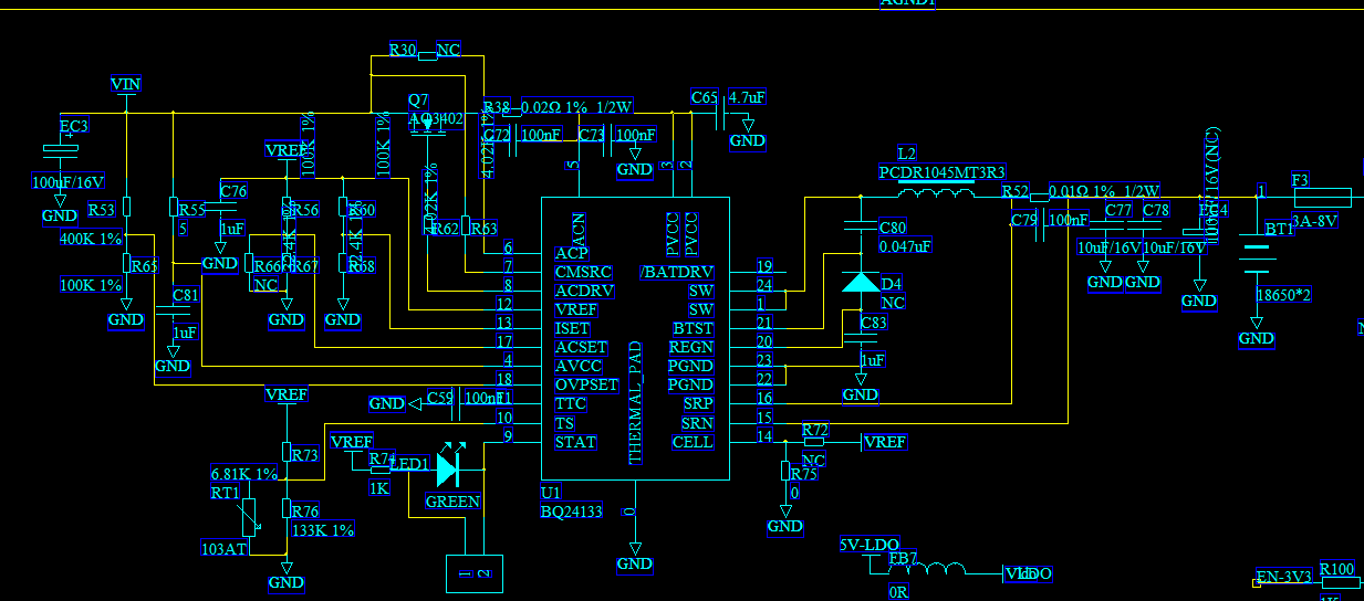 使用BQ24133充电,电池电压如果在3.5V以上的话就正常充电,电流正常,但是如果电池电压使用到了3.5以下的话,芯片就不往电池里面充电。两节18650锂电池并联。附件是电路图,谢谢。