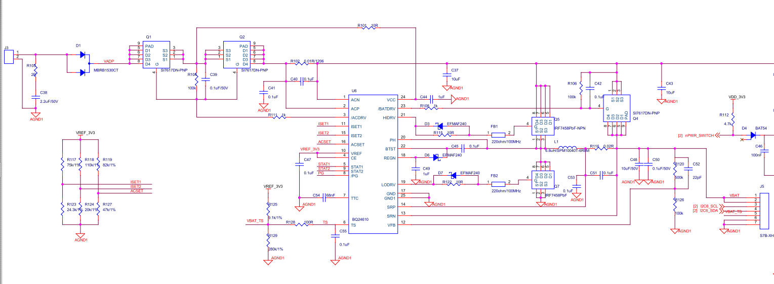请教,我设计的BQ 24610充不了电。没接电池,当前背靠背MOS管的GS之间一直是低,即/ACDRV没有输出低,所以背靠背MOS管Q1与Q2一直是关闭状态。Vref 3.3V是正确的,TS管脚还没有接热敏电阻,因此我把分压的下拉电阻R129并了一个10K的电阻,当前TS的输入电压大概是1.65V左右。麻烦TI的同事帮忙看下有什么思路没