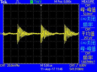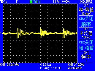 接明纬AC-DC开关电源,开关频率约62.5KHz,输出电压-16.12V,测得纹波噪声峰-峰值如图: