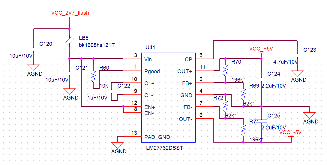 我用3.3V声称正负3V电源。发现负电源噪声太大,负电源-3V上输出上有3kHz左右的锯齿波,峰峰值40mV,手册上声称的是20uVRMS啊,差别太大了。刚开始怀疑负载的问题,现在把负载芯片全拆了还是这样,怎么回事,如何消除这个锯齿波?