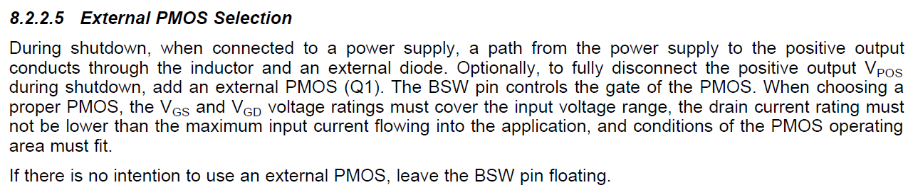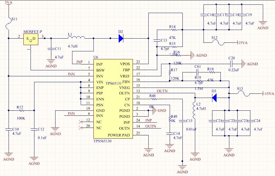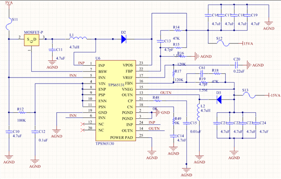 下图是我按照数据手册设计的5V转正负15v的电路。根据数据手册里,当管脚8 ENP为高电平时,管脚7 BSW应该输出低电平,这样mos管就可以导通。但是我测试的时候总是测得ENP输入高电平,此时BSW输出也是高电平,mos管不能导通,因此也没有后续输出。换了两三个芯片都是这种情况。想请教一下这是哪里出了问题?