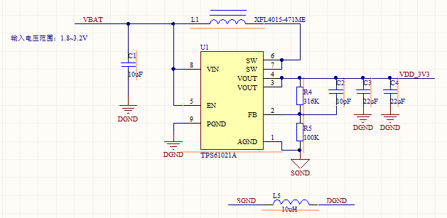 请问,按照TPS61021A模块的典型电路设计,原理图如下,为什么在输入是1.8~3.2V的时候,输出不是3.3V,而是3.5V呢?请大侠指教。