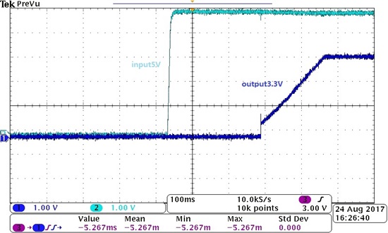 可以看到Input 5V 上电以后很久才OUTPUT, 而且output的上升时间也接近需要200MS。和SPC上的严重不符合。output上的option 100uf加上以后测量的波形也一样。