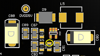 上图为原理图所对应的PCB图(请忽略电容C93,实际未焊接)。PCB图里,黄色圈起来的地方为测量点(测量点为R79的一个焊盘,此焊盘与芯片的“EN”引脚直接相连)。为了查找芯片不工作的原因,我用万用表和示波器进行测量。在测量过程中,发现两个奇怪的现象。