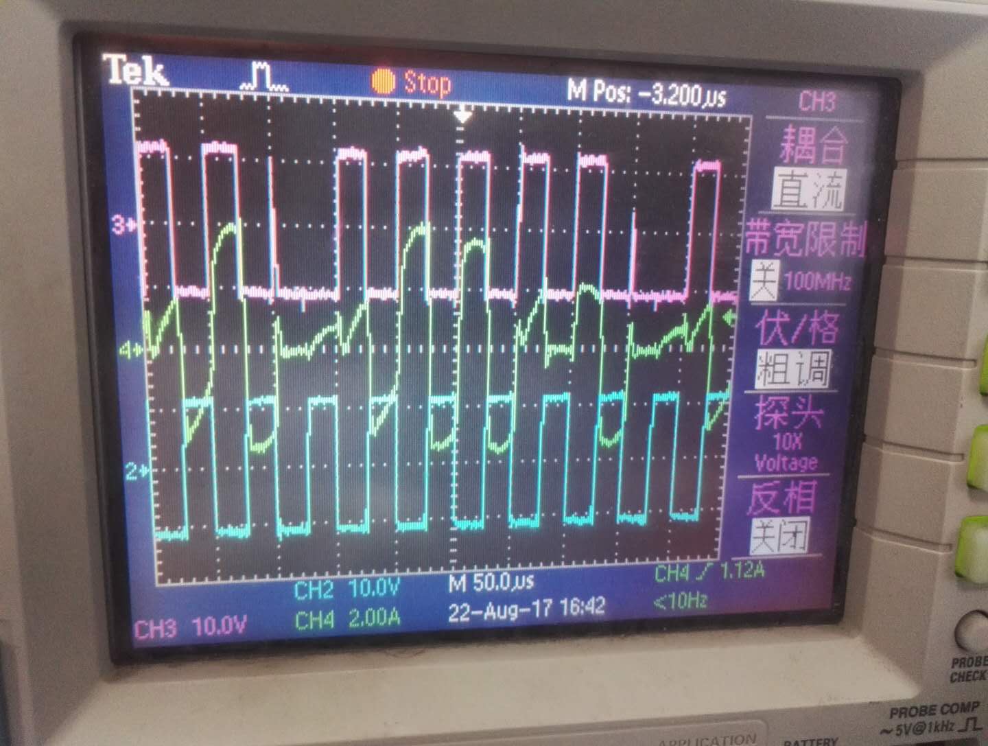 但是目前只是原边采用电池(40-45V)作为输入,副边采用50Ω电阻作为输出,前后桥的脉冲相位差进行开环控制,控制在1.5-2.5μs之间。但是当电池为44V时,移相角度大约在2μs时,就出现原边桥中两个下管存在脉冲丢失的现象,导致变压器发出声响,变压器的一二次侧电流出现断续,其他移相角度都没问题。当电池为42V时,移相角度大约在1.7μs时,出现原边桥两个下管脉冲丢失,导致变压器发出声响,变压器的一二次侧电流出现断续,其他移相角度都没问题。