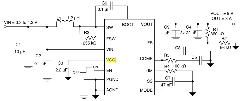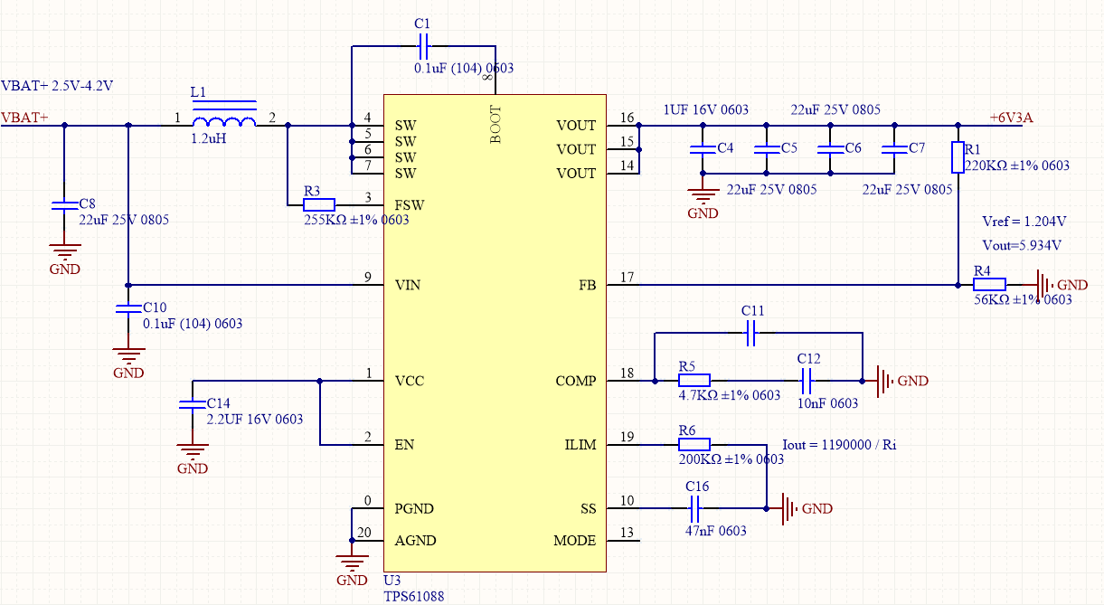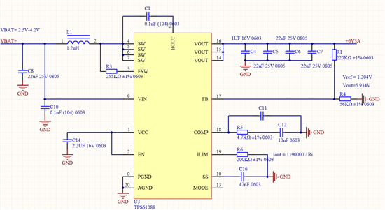 1.这个芯片的启动电压为2.7V,你可以借助TI的webench在线仿真得到电路图。 这个芯片欠压保护在2.5V,所以当电压下降到2.5V之前仍可以工作,才是你需要注意的是选择功率电感饱和电流更大一点的电感。