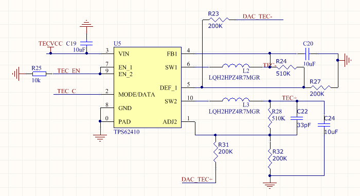 是的,这个使用在激光器TEC上面的,两路输出分别TEC+与TEC-两端,通过控制两路DC-DC之间的压差来改变电流的流向。