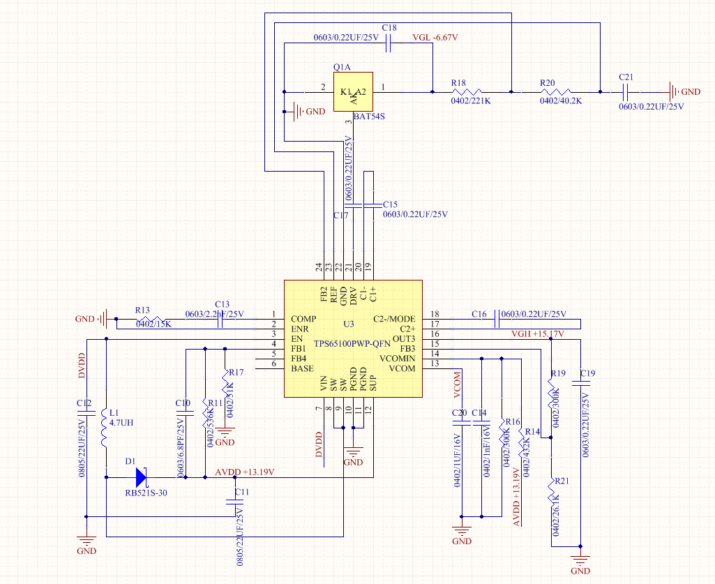 SUP电压没有问题,能正常输出我需要的13.19V,有问题的电压是VGH的电压也就是V03电压,你看我的电路图,设计的电压是15.17V,但是在三倍电压模式下,得到的输出电压却是25.6V,更改为两倍模式后电压才正常了