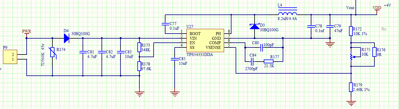 TI工程师你们好,问一下我这个电路在瞬间通电(用导线碰)后,TPS54331就坏了呢?没输出了,瞬间通电时有火花,是不是电感放导致的啊,但这时官方手册里的典型应用电路,怎么会这样呢?
