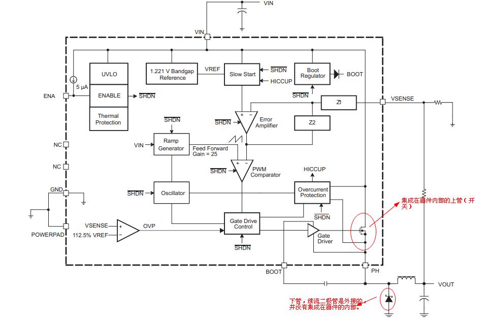 上管MOSFET便是集成在器件的内部,而下管(续流二极管)是外部接的,并没有集成在器件内部。