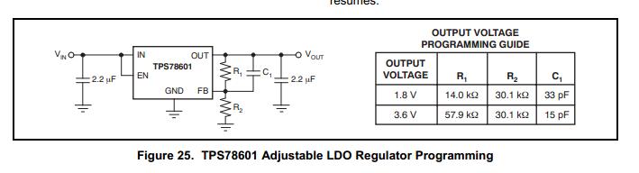 NR/FB的使用:对于该器件TPS78601是输出可调的器件,不需要接一个旁路电容,而对于其他的固定输出的器件可接一个旁路电容以构成低通滤波器来减小纹波。而对于输出可调的器件,该引脚作反馈用途,如果加一个电容,会引入一个极点,从而破坏原有的环路的稳定性。请参考图25的接法。